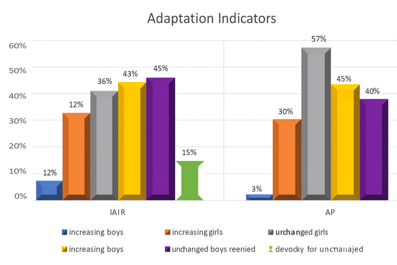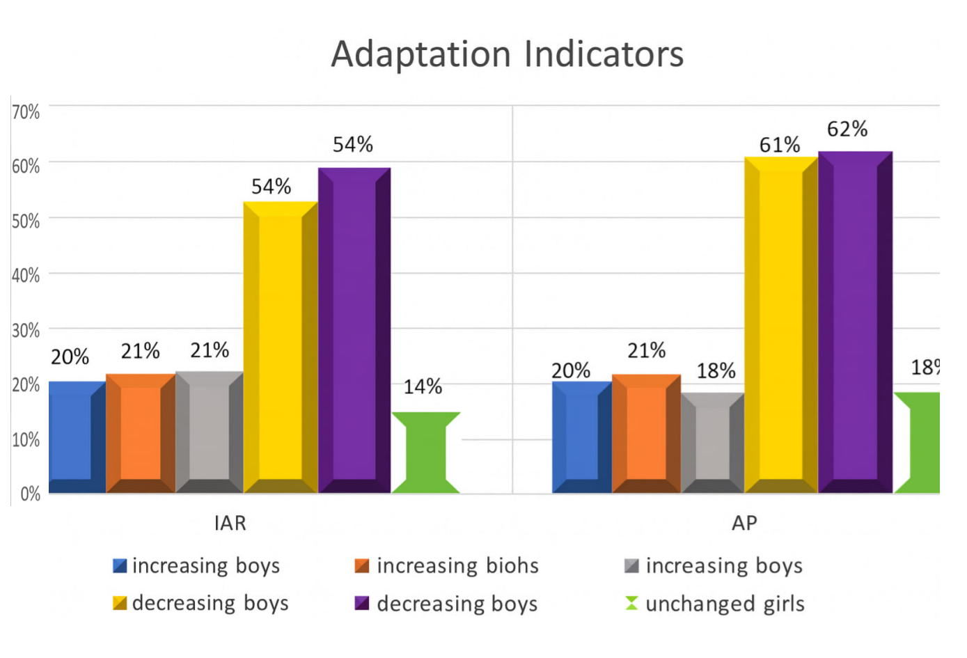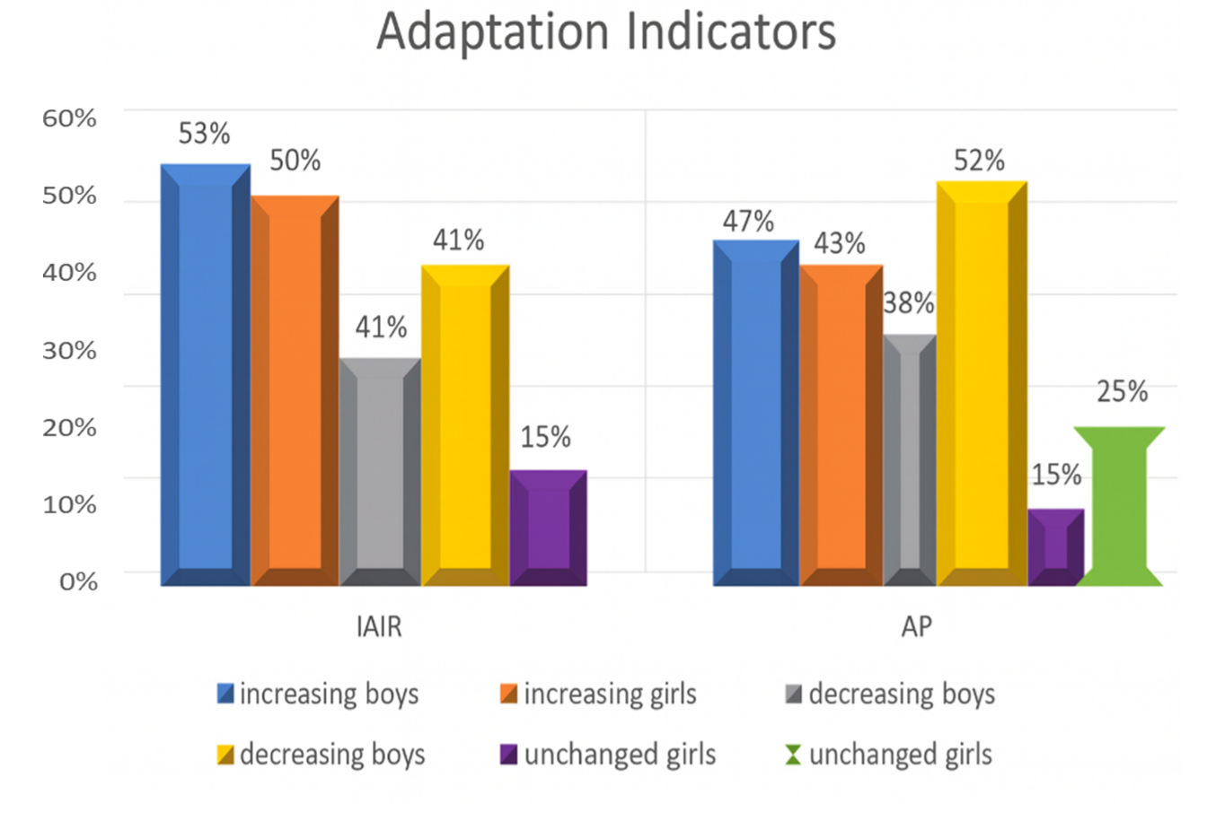 By the end of the preparatory period, in boys, the Individual Functional Index (IFI) remained practically unchanged, increasing only by 0.53%, while Adaptation Potential (AP) increased slightly by 0.44%. In girls, IFI did not change from the beginning to the end of the preparatory period, and AP increased by 0.44% (Table 7).It is noteworthy that the dynamics of indices within each group were inconsistent. In boys, IFI increased in 20% of cases, decreased in 21.6%, and remained unchanged in 58.3%. In girls, IFI increased in 21.4% of cases, decreased in 53.5%, and remained practically unchanged in 14.25% of athletes.AP in boys increased in 20% of cases, decreased in 18.3%, and remained practically unchanged in 61.6%. In girls, AP increased in 21.4%, decreased in 60.7%, and remained unchanged in 17.85% of athletes. | Figure 8. Relative distribution of athletes with positive, negative, and unchanged adaptation indicators during the preparatory training period |