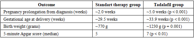 By inclusion criteria, 100% of the fetuses had absent end-diastolic flow in the umbilical artery. None of the women had severe preeclampsia at enrollment; however, mild preeclampsia or gestational hypertension was noted in a few cases (2 in the tadalafil group and 1 in the control group). Other maternal factors such as chronic hypertension (treated) or gestational diabetes were evenly balanced between groups. There were no significant differences in any baseline characteristic recorded.Tadalafil therapy resulted in a significantly longer duration of pregnancy after diagnosis compared to standard care alone. Women in the Tadalafil group remained pregnant for an average of about 5.0 weeks after enrollment, whereas those in the Control group averaged only about 2.0 weeks (p < 0.001). (Table 2) This corresponds to approximately 35 days of additional gestation gained with tadalafil treatment versus about 13 days without it. Nearly all women receiving tadalafil achieved at least 4 extra weeks of pregnancy beyond the point of diagnosis, allowing many of them to reach the early third trimester, whereas such prolongation was very uncommon in the control group. Consequently, the gestational age at delivery was substantially higher with tadalafil. The median delivery timing in the Tadalafil arm was ~34 weeks, compared to ~29–30 weeks in the Control arm, a difference that was highly significant and clinically important. In fact, a majority of tadalafil-treated pregnancies crossed the critical 32-week gestational threshold (5 of 7 cases, vs. 0 of 6 in controls), and several reached 33–34 weeks, while none of the control pregnancies progressed beyond 31 weeks. This marked extension of gestation in the treatment group shifted many deliveries from the extremely preterm period into a later gestational age range, which is known to greatly improve neonatal outcomes.Table 2. Key pregnancy outcomes and neonatal results (values are approximate averages or counts, with p-values for group comparisons where significant)  |