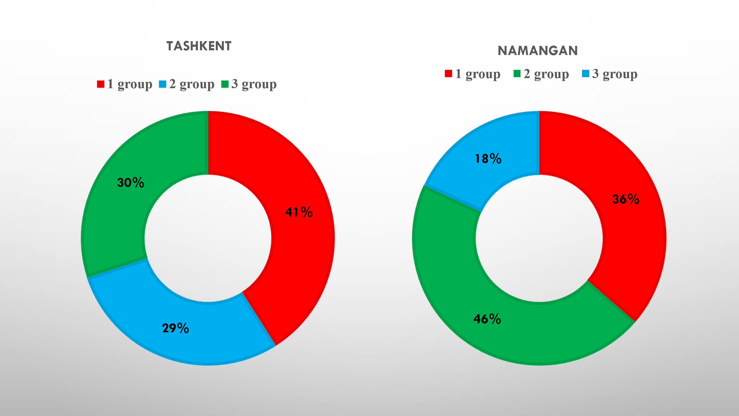 Out of 100 patients included in the study in Tashkent, Group 1 (n=41; 41%) consisted of pregnant women with vitamin D deficiency, Group 2 (n=29; 29%) – with vitamin D insufficiency, and Group 3 (n=30; 30%) – with optimal vitamin D levels (control group). Thus, vitamin D deficiency among pregnant women in Tashkent occurred 1.4 times more frequently compared to insufficiency and normal levels.In Namangan, 66 pregnant women were examined. Among them, vitamin D deficiency was identified in 36.4% (n=24), insufficiency – in 45.5% (n=30), and optimal levels – only in 18.1% (n=12). Unlike Tashkent, vitamin D insufficiency predominated in Namangan, while the proportion of women with adequate vitamin D status was almost twice as low (18.1% vs. 30%). | Figure 1. Structure of pregnant women, (%) |