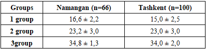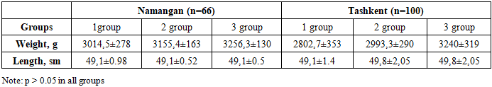 Table 4 shows comparing the anthropometric parameters of newborns, a similar pattern was observed in both Namangan and Tashkent: with adequate maternal vitamin D status, neonatal weight and length were higher than in cases of deficiency or insufficiency. Under conditions of deficiency, the mean birth weight in Namangan was 3014.5 ± 278.5 g, which only slightly exceeded the corresponding value in Tashkent (2802.7 ± 353 g). In the insufficiency group, neonatal weight reached 3256.4 ± 163.3 g in Namangan versus 2993.3 ± 290 g in Tashkent. In the group with normal vitamin D levels, the values were very close — 3155.3 ± 130.4 g and 3240 ± 319 g, respectively.Table 4. Anthropometric parameters of newborns after delivery (M±m)  |