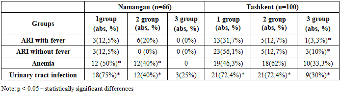 Table 2 presents the incidence of somatic diseases during pregnancy. In Namangan, among pregnant women with vitamin D deficiency, the most frequent complications were urinary tract infections — 18 cases (75.0%), as well as anemia — in 12 women (50.0%). Respiratory infections in this group were observed much less frequently: acute respiratory infections (ARIs) with and without fever were registered in only 3 women (12.5%). In Group 2, the rates were somewhat lower: anemia and UTIs were noted in 12 women each (40.0%), while ARIs with fever were recorded in 6 women (20.0%). In the control group with normal vitamin D levels, complications were almost absent: only one woman was diagnosed with a urinary tract infection, while anemia and respiratory infections were not detected.Table 2. Somatic diseases during pregnancy (abs., %)  |