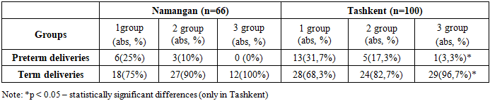 In Tashkent, respiratory infections predominated in cases of vitamin D deficiency. Thus, ARIs with fever occurred in every third pregnant woman, and without fever — in every fifth. The incidence of anemia was 57 cases (46.3%), while urinary tract infections were detected in 78 women (63.4%). In Group 2, the structure of complications was similar: anemia (62.0%) and UTIs (72.4%) prevailed, whereas respiratory infections were less common (12.7%). In the control group with normal vitamin D levels, complication rates were minimal: one-third of pregnant women had anemia and urinary tract infections, while ARIs were reported in every tenth case (33.3%, 33%, and 10%). Thus, in Namangan region, vitamin D deficiency was more strongly associated with urinary tract infections and anemia, whereas in Tashkent it was accompanied by a higher frequency of respiratory infections.Comparative analysis of the course of labor showed that in Namangan, preterm deliveries were recorded in 9 women (13.6%), whereas in Tashkent they were observed in 19 women (19.0%). Term deliveries accounted for 86.4% and 81.0%, respectively. The obtained differences were not statistically significant, indicating the absence of substantial regional variations in this parameter, as shown in Table 3.Table 3. Course of labor (abs., %)  |