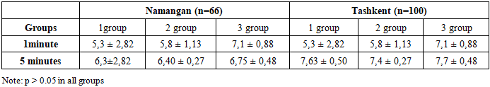 Newborn length was also within comparable ranges: in Namangan — from 49.0 ± 0.98 cm to 50.3 ± 0.52 cm, and in Tashkent — from 49.1 ± 1.4 cm to 50.0 ± 1.25 cm. The differences between the regions did not reach statistical significance, which confirms the universal nature of the identified trend: adequate maternal vitamin D status is associated with more favorable neonatal anthropometric parameters, regardless of the region of residence.Assessment of neonatal condition using the Apgar score (Table 5) demonstrated that mean Apgar values at the 1st and 5th minutes were higher in groups with adequate vitamin D levels in both Namangan and Tashkent. In Groups 1 and 2, the indicators in Namangan slightly exceeded those in Tashkent, whereas in Group 3, newborns in Tashkent showed higher mean scores (7.1 ± 0.88 and 8.8 ± 0.93 versus 6.75 ± 0.48 and 7.75 ± 0.48, respectively). Despite these differences, statistical significance between the regions was not confirmed. The overall trend remained consistent: with optimal maternal vitamin D levels, newborn Apgar scores were higher.Table 5. Apgar score of newborns (M±m)  |