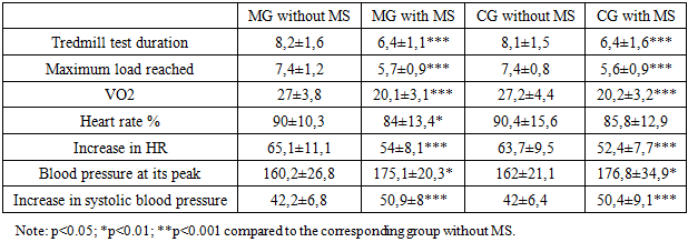 Analysis of the treadmill test results showed a significant decrease in functional reserve in patients with chronic heart failure and obesity in the presence of metabolic syndrome (Table 1).Table 1. Indicators of exercise tolerance in patients with CHF and obesity  |
