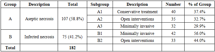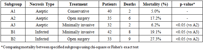 The comparative analysis of mortality rates among the studied subgroups revealed statistically significant differences that have important clinical implications. The overall mortality rate in Group A (aseptic pancreatic necrosis) was 10 patients out of 107, representing 9.3% of this population. This relatively favorable outcome reflects the less severe disease course typically associated with sterile necrosis compared to infected necrosis, assuming appropriate management is provided. However, mortality still occurred in nearly one in ten patients, underscoring that aseptic necrosis remains a serious condition with life-threatening potential.Table 1. Distribution of Patients by Groups and Subgroups  |