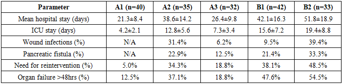 Group B patients with infected pancreatic necrosis demonstrated overall higher mortality than Group A, consistent with extensive literature documenting infection as a major risk factor for death in acute pancreatitis. The presence of infected necrotic tissue creates ongoing sepsis, challenges immune function, and necessitates source control through drainage or debridement. Even with optimal management, mortality remains substantial in this population.Within Group B, subgroup B1 patients treated with minimally invasive interventions experienced 8 deaths among 42 patients, representing a mortality rate of 19.1%. While notably higher than the minimally invasive group with aseptic necrosis (19.1% versus 6.2%, p<0.05), this outcome compares favorably to historical series reporting mortality of 30-50% for infected necrosis managed with open surgery. The statistically significant difference between subgroups A3 and B1 (p<0.05) confirms that infection status fundamentally influences prognosis even when similar minimally invasive techniques are employed.Subgroup B2, managed with open surgical interventions for infected necrosis, demonstrated the highest mortality in the entire study with 9 deaths among 33 patients, yielding a rate of 27.3%. This outcome reflects the combination of severe underlying disease (infected necrosis) with the physiological stress of major open surgery. The comparison between subgroups A2 and B2, both involving open surgery but differing in infection status, revealed statistically significant differences (17.2% versus 27.3%, p<0.05), confirming that infection increases mortality risk even within a given surgical approach.The comparison between subgroups B1 and B2, both addressing infected necrosis but with different surgical approaches, showed mortality of 19.1% with minimally invasive interventions versus 27.3% with open surgery. This 8.2 percentage point difference, while not reaching statistical significance in our sample size, suggests a trend favoring minimally invasive approaches. Larger studies or meta-analyses might clarify whether this difference represents true clinical benefit or reflects patient selection factors.The mechanism underlying improved outcomes with minimally invasive interventions likely involves multiple factors. Reduced surgical trauma minimizes the systemic inflammatory response superimposed on existing pancreatitis-related inflammation. Preservation of abdominal wall integrity avoids the complications associated with large incisions including wound infections, dehiscence, and ventral hernia formation. Shorter operative times reduce anesthesia duration and associated risks. The ability to perform step-up approaches, beginning with simple drainage and escalating only as needed, allows tailoring intervention intensity to disease severity and response.Patient selection undoubtedly influenced the observed outcomes. Minimally invasive interventions were preferentially applied to patients with more favorable anatomy, limited necrosis extent, and sufficient hemodynamic stability to tolerate the procedures. Conversely, open surgery was more commonly performed in patients with extensive necrosis, hemodynamic instability, or anatomical factors precluding minimally invasive access. These selection factors may have contributed to outcome differences beyond the inherent effects of surgical technique itself.Table 3. Complications and Length of Stay by Treatment Approach  |