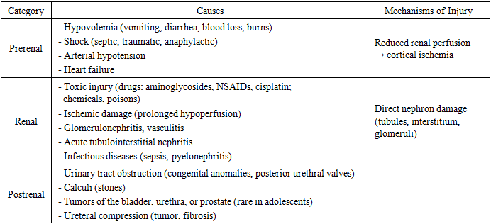 At present, acute kidney injury (AKI), including forms induced by toxic exposures, remains one of the major causes of impaired renal function in children and often determines clinical outcomes. In critically ill pediatric patients, AKI-associated mortality reaches approximately 25% by day 28 [1].The first internationally accepted consensus definition of AKI was introduced in 2005 during the Acute Kidney Injury Network (AKIN, Amsterdam) conference. It recommended replacing the term “acute renal failure” with “acute kidney injury” (AKI), while reserving “acute renal failure” only for the most severe cases [2]. AKI is now recognized as a syndrome of progressive kidney dysfunction, ranging from minimal functional impairment to complete loss of renal ability to maintain water, electrolyte, and acid-base balance. Etiologies include severe trauma, major surgery, infectious diseases, and rapidly progressive hereditary disorders [3].Among the leading causes of AKI in children today are oral poisonings of chemical or drug-related origin. Toxic exposures frequently lead to toxic nephropathy, which is often complicated by AKI [4,5]. Nephrotoxic agents exert direct cellular toxicity, disrupt renal microcirculation, cause tissue hypoxia, and trigger immune-mediated damage. As a result, the ICD-10 introduced class N14 — “tubulointerstitial and tubular lesions induced by drugs” [6]. In hospitalized children, administration of nephrotoxic drugs is a major contributor to AKI [8,9]. Accidental or intentional ingestion of toxic doses (poisoning) further increases the risk. Critically ill children are particularly vulnerable due to the combined effects of sepsis, hypotension, polypharmacy, and difficulties in accurate renal function assessment [10,11]. Currently, no definitive curative treatment for AKI exists. The main modifiable risk factor remains avoiding unnecessary nephrotoxic agents when safer alternatives are available. Early detection is difficult since pediatricians and nephrologists still rely on serum creatinine levels, which rise only at later stages. Promising biomarkers such as NGAL, KIM-1, and cystatin C have the potential to identify AKI earlier, before serum creatinine increases [12]. From a pathophysiological perspective, three major categories of AKI are distinguished:• Prerenal (impaired renal perfusion due to hypotension, hypovolemia, or shock),• Renal (toxic or ischemic injury, inflammatory processes),• Postrenal (urinary tract obstruction) [13].In summary, oral poisonings in children represent one of the most important risk factors for AKI. This condition highlights the need for early recognition, cautious drug administration, and timely supportive treatment to prevent long-term renal complications Table 1. Table 1. Major Causes of Acute Kidney Injury (AKI)  |