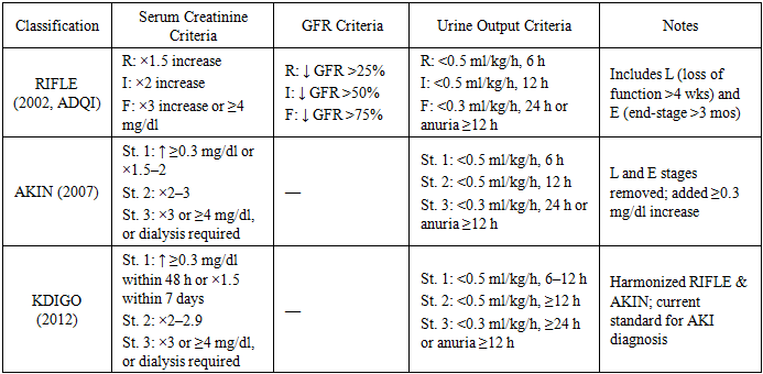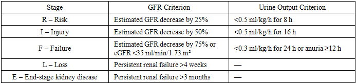 In clinical practice, acute kidney injury (AKI) is diagnosed based on changes in serum creatinine and urine output. According to current standards, AKI is defined by the presence of at least one of the following:• an increase in serum creatinine (SCr) of ≥0.3 mg/dl (≥26.5 μmol/L) within 48 hours;• an increase in SCr to >1.5 times baseline (if known, or assumed to have occurred within the previous 7 days);• urine output <0.5 ml/kg/h for 6 consecutive hours [7].In pediatrics, however, these criteria are less reliable because serum creatinine levels depend strongly on age, body weight, and muscle mass. To address this, in 2007 the pediatric-modified RIFLE (pRIFLE) scalewas introduced. This classification accounts for reductions in glomerular filtration rate (GFR) and urine output specific to children, and it plays a critical role in both staging AKI and determining the timing of renal replacement therapy (RRT).Also in 2007, the international expert group AKIN (Acute Kidney Injury Network) proposed an updated system for stratifying AKI severity. This was a modification of the original RIFLE criteria, aimed at increasing sensitivity and improving early detection. Importantly, the AKIN definition incorporated even small rises in serum creatinine (≥0.3 mg/dl), which allowed clinicians to identify high-risk patients earlier and initiate therapy sooner (Table 4).Thus, the progression from RIFLE to pRIFLE and AKIN has significantly improved the accuracy of AKI diagnosis, monitoring, and prognosis in both adults and children, and laid the groundwork for the KDIGO (2012) international guidelines.Evolution of Classifications and Modern Diagnostic Criteria of AKIThe stratification system for acute kidney injury (AKI), based on changes in serum creatinine (SCr) and/or urine output, is largely similar to the RIFLE classification, but differs in several important aspects. In modified versions, the classes L (Loss) and E (End-stage) are no longer considered stages, but rather outcomes of AKI. Moreover, the R (Risk) category in RIFLE corresponds to Stage 1 AKI in the AKIN system, while I (Injury) and F (Failure) correlate with Stages 2 and 3 of AKIN, respectively.In 2012, the Kidney Disease: Improving Global Outcomes (KDIGO) workgroup proposed a unified definition of AKI stages, integrating features of both RIFLE and AKIN (Table 4). While the previously used criteria were retained, two new parameters were introduced:• an estimated glomerular filtration rate (eGFR) <35 ml/min/1.73 m² in patients under 18 years,• initiation of renal replacement therapy (RRT) as a marker of the most severe AKI stage.Table 3. Pediatric RIFLE (pRIFLE) Criteria for AKI (2007)  |