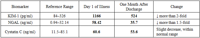 The concentrations of acute kidney injury (AKI) biomarkers in urine varied depending on the severity of poisoning and the type of toxic agent. Notably, serum creatinine elevation was not observed in any of the examined children, highlighting its limited sensitivity for detecting early kidney damage.At the same time, 14 patients (11.6%) demonstrated urinary NGAL levels above the maximum values of the control group, while 15 patients (12.5%) had increased urinary KIM-1. In contrast, urinary cystatin C in most cases (79 children) was below the minimal control values, and in no case did it exceed the upper reference range. This frequent reduction in cystatin C excretion may reflect elevated serum levels, representing a kind of “mirror effect.” Thus, low urinary cystatin C could potentially serve as an additional diagnostic marker of AKI, although such a conclusion cannot be made without simultaneous serum measurements.Based on the study results, it can be concluded that the most informative urinary markers of AKI in children with chemical oral poisonings are NGAL and KIM-1. Their significant increase was most often observed in children with intoxications caused by NSAIDs, neuroleptic drugs, caustic agents, and vinegar essence—the same categories that, according to retrospective analysis, had the highest incidence of renal complications.Clinical case. Patient A., a 1-year-1-month-old girl, was admitted to the Toxicology Department of Filatov Children’s City Hospital No. 13 with the diagnosis: “Severe vinegar essence poisoning.” Upon admission, her condition was critical, with marked respiratory failure requiring mechanical ventilation. Clinical examination revealed extensive chemical burns of the oropharynx, upper respiratory tract, and upper gastrointestinal tract, as well as skin burns (anterior chest surface — approximately 10%).This case exemplifies the severity of systemic manifestations in caustic substance poisonings and the high risk of AKI, emphasizing the need for early biomarker-based diagnostics.Clinical Case Results. At admission, the following findings were obtained in a child with severe vinegar essence poisoning:• Complete blood count: hemoglobin — 80 g/L, neutrophilic left shift, ESR — 35 mm/h.• Acid–base balance: pH — 7.45; pCO₂ — 43.6 mmHg; Hb — 82 g/L; Ht — 25%.• Urinalysis: erythrocytes — 23 per HPF; protein — 0.9 g/L.• Renal ultrasound: right kidney — 62.8 × 28.6 mm, left kidney — 65.9 × 26.7 mm; parenchymal thickness right — 13 mm, left — 9 mm; preserved corticomedullary differentiation; diffuse cortical hyperechogenicity.• Chest X-ray: enhanced vascular pattern, subsegmental atelectasis in the left upper lobe.• ECG: sinus rhythm, heart rate 150–160 bpm.• Oliguria.• Biochemistry: no azotemia (creatinine — 38 µmol/L, urea — 5.8 mmol/L).• eGFR (Schwartz formula): 105.2 ml/min.By the end of the first day of illness, urinary AKI biomarkers were measured:• KIM-1: 1166 pg/ml (reference 84–326 pg/ml);• NGAL: 58.42 ng/ml (reference 0.94–32.14 ng/ml);• Cystatin C: 60.6 ng/ml (reference 11.5–85.1 ng/ml).These results confirmed the presence of acute kidney injury (AKI) already on the second day, well before the appearance of azotemia. Early diagnosis made it possible to promptly adjust therapy: in addition to infusion, antibacterial, and symptomatic treatment, energy-tropic and angioprotective agents were introduced for 30 days.Follow-up. At one month after discharge, repeat testing showed a clear decline in urinary AKI biomarkers:• KIM-1: 524 pg/ml (reference 84–326 pg/ml);• NGAL: 35.7 ng/ml (reference 0.94–32.14 ng/ml);• Cystatin C: 53.6 ng/ml (reference 11.5–85.1 ng/ml).Thus, early detection of AKI and timely therapy resulted in a favorable dynamic: KIM-1 decreased more than twofold, NGAL decreased by over 1.5 times. This case highlights the importance of novel biomarkers in identifying AKI before conventional signs such as azotemia appear, which is critical for prognosis in children with severe chemical poisonings. Table 5.Table 5. Dynamics of AKI Biomarkers in a Child with Severe Vinegar Essence Poisoning  |