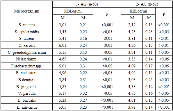 Dental examinations were carried out among 152 children aged 10-18 who applied to the dentist for treatment at the Bukhara State Medical Institute "dental center", of which 122 dental rows are children with gingivitis caused by orthodontic treatment of anomalies and deformities, and 30 healthy children. Of the children examined, 76 were girls and 76 were boys. All checked D. According to a Calvelis, young groups are formed depending on the periods of formation of the bite. The 1stGuruh is the night exchange period (10-13 years old) with 44 children (boys 24 and girls 20); the 2nd Guruh is the permanent bite period (14-18 years old) with 78 children (boys 38 and girls 40). Local and general etiological as well as pathogenetic factors have been identified that lead to inflammation of the parodont tissue in Primary Children. All patients who met the criteria for inclusion in the study were invited for a dental examination and were examined, the indices were evaluated and an exudate was obtained from the periodontal pocket for microbiological and biochemical study. Selected according to the criteria for inclusion in the study and passed a dental examination at the first stage, hygiene products were selected and the first stage of professional Hygiene applied dental rows children with gingivitis caused by orthodontic treatment of anomalies and deformities the main Group (AG) patients numbered -122 people. It is classified into 2 subgroups according to treatment procedures performed in the main group of patients. AG-1 (n=60) had conventional treatment. In the case of AG-2 (n=62), however, complex therapy was performed using "pomegranate bean oil" and "aseptaprapolis" gel with individually transported Cappas in additional gum pockets to the traditional cure [1,3,5,7,9,11,13,15]. The research materials were conducted from statistical processing using parametric and non-symmetric analysis methods. The first data collection, correction, systematization and visualization of the results obtained were carried out in the Microsoft Office Excel 2016 spreadsheets. In our scientific study, we conducted dental examinations among 152 children aged 10-18, of which 122 were children with gingivitis caused by orthodontic treatment of tooth row anomalies and deformities, and 30 were healthy children. They applied to the "dental center" of the Bukhara State Medical Institute for treatment to the dentist. The complex treatment performed is inflammation in the parodont tissues there is a tooth row anomaly and deformity in patients of the 1st main group who received traditional treatment treatments of the main guru S. mutans 3.01±0.21; S. epidermidis 5.43±0.25; S. aureus 5.41±0.16; C. xerosis 6.21±0.24; C. with pseudodiphthericum being 5.15±0.13 KHQB Log/ml, Major Group 2 patients who received complex treatment had S. mutans 2.12±0.15; S. epidermidis 4.23±0.23; S. aureus 3.89±0.11; C. xerosis 4.26±0.13; C. pseudodiphthericum has been found to be 3.91±0.11 KHQB Log/ml (Table 1).Table 1. Types of microorganisms identified from tooth-gum pockets after treatment in groups  |