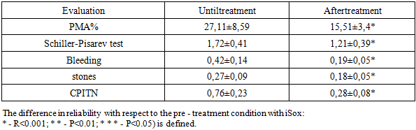 Analysis of microflora dynamics in periodontal pockets has made it possible to conclude that when applying the complex treatment we recommend, the composition of microflora in the exudate of the periodontal pocket is normalized at the expense of completely eliminating one type of pathogen and reducing the amount of others. After the use of developed complex treatment-prophylaxis, according to the testing of Schiller - Pisarev in the main group, the index of Schiller-Pisarev fracture in the main group decreased by 1.79 points, in the control group - by 1.21 points (table 2). In children of the main group, professional oral hygiene was carried out, individual oral hygiene was taught to children and their parents, tartar was removed on a skewer.Table 2. Hygiene condition of the oral cavity and paradont tissue 6 months after treatment of dental row anomalies and deformities  |