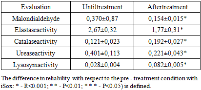 The values of the RMA index in children of the main group exceeded 1.4 times, the corresponding indicators of the control group increased by 1.7 times. Using the laboratory methods of the study, the activity of Mallon dialdehyde, elastase, lysozyme, urease and catalase in children with gingivitis caused by the orthodontic treatment of tooth row anomalies and deformities was studied, which are presented in Table 2. The data presented in the table showed that the catalase activity in children with gingivitis caused by the orthodontic treatment of tooth row anomalies and deformities was on average 2 times lower than in almost healthy children in an initial clinical-laboratory study. This condition has testified to a decrease in the reserve capacity of the antioxidant system in children with gingivitis caused by the orthodontic treatment of tooth row anomalies and deformities.Table 3. The main group is the dynamics of the change of biochemical parameters of oral fluid in children after treatment (mccat/l and Ed / ml)  |