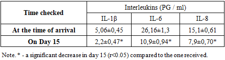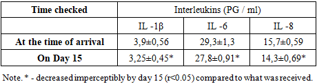 In order to assess the indicators of the systemic immune response of the body, the amount of serum cytokines (il-1β, il-6, and il-8) from 25 patients from each group was studied by the method of solid-phase immunoferment analysis (IFA) using a set of reagents ("vector-Best," Russia). Patients with deep disorders of esophageal sopor-coma I and psychomotor arousal were treated according to standard protocols using anti-cranial, membranastabilizing, antioxidant, sedative, anticoagulant, and antiagregant group drugs. When studied on the 15th day of treatment in the main group of patients with II who used immunocorrectional therapy (Acridopheron) in addition to standard therapy, the incidence of serum anti-inflammatory cytokines was lower compared to the rates studied when hospitalized. At the same time, significant reductions in the following cytokines were noted: il-1β 2.3 times (2.2±0.47 PG/ml versus 5.06±0.45 PG/ml); il-6 2.4 times (26.16±1.3 PG/ml versus 10.9±0.94 PG/ml); il-8 1.9 times (15.1±0.61 PG/ml versus 7.9±0.70 PG / ml. At the same time, clinical indicators have also improved: clarity of consciousness, patient access to communication, orientation in space and time, stabilization of hemodynamics, swallowing recovery, improved independent adequate breathing, improved plegian position in the limbs up to paresis. In addition to standard therapy, immunocorrectional therapy has been used in the main group of patients with ischemic stroke, dynamic changes in the content of serum cytokines (PG/ml) (Table 1).Table 1. In patients with II in the main group of patients indications of serum interleukins after immunocorrigiratory therapy  |