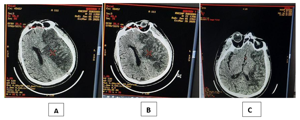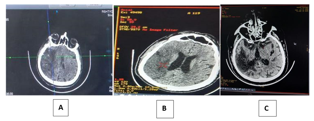 Thus, the results of the study of changes in systemic (serum) and cellular and humoral immune indicators of the cytokine profile showed that in ischemic stroke, inflammation was acquired and is accompanied by hypersecretion of anti-inflammatory cytokines, the production of which has significant properties in the dynamics of the development of the inflammatory process that occurs in ischemic stroke. The first day after cerebral ischemia (acute period) received serum inflammation (il-1β, il-6, il-8) with a significant increase in cytokine concentration. Such hyperproduction of inflammatory mediators was assessed as an adequate initial reaction of the immune system to injury and was explained by the predominance of the local level cytokine concentration - the characteristics of their secretion at MNS. Received inflammation in cerebral ischemia (il-1β, il-6, il-8) a significant decrease in the concentration of cytokines on the 15th day of the disease in the blood serum reflects the severity of the inflammatory process in the brain, an increase in the permeability of the hematocephalic barrier, which is characteristic of severe forms of II, which can serve as a reliable prognostic criterion for. | Figure 6. MSKT examination of a patient with ischemic stroke in the comparison group (A - during admission, V - after day 7, s-after day 15) |