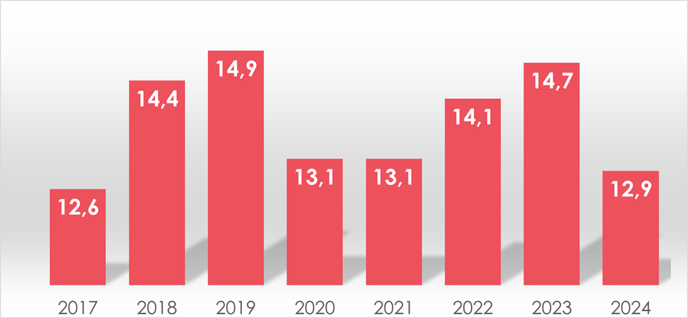 During the study period, 89 maternal deaths were registered in the region. The MMR oscillated between 11.3 and 14.9 per 100,000 live births. The lowest value was recorded in 2017 (12.6), the highest in 2019 (14.9). The average ratio over the analyzed years was 13.73 ± 1.15. Despite observed fluctuations, no definitive upward or downward trend was identified; instead, the data reflect seasonal or random variations. The notable decline in 2024 may indicate positive developments in maternal healthcare or the effectiveness of preventive interventions (figure 1). | Figure 1. Trends in the maternal mortality ratio (MMR) per 100,000 live births in the Andijan region, Uzbekistan, 2017–2024. Data were obtained from the official records of the Andijan Regional Health Authorities. MMR = maternal mortality ratio (number of maternal deaths per 100,000 live births) |