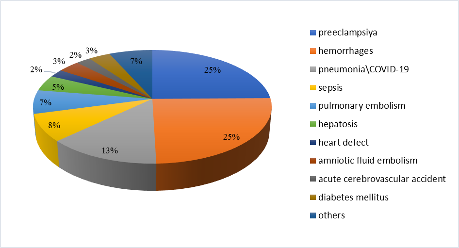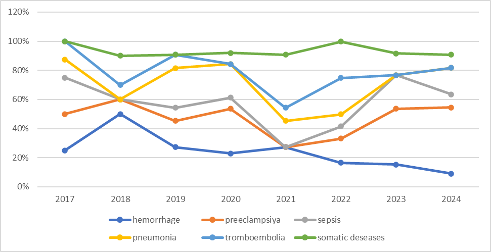 Figure 3 depicts annual distributions of the main causes. Hemorrhages and preeclampsia remained leading factors throughout the period, with considerable variability. In 2017, hemorrhages and preeclampsia represented approximately equal shares (38% and 37,5%, respectively), while in 2023 and 2024, the share of preeclampsia increased sharply to 50% and 45.4%. The incidence of sepsis varied from 0 to 25%, reflecting fluctuating impacts of infectious complications. Pneumonia showed elevated rates in 2019 and 2020 (27.2% and 23%), declining thereafter. Pulmonary embolism showed notable variability, peaking at 25% in 2022 but absent in some years. Since 2021, comorbid somatic diseases have become more prominent, reaching 27–30% in 2023–2024, indicating growing influence of chronic conditions on maternal mortality (figure 3). | Figure 3. Dynamics of maternal mortality causes in the Andijan region, 2017–2024. Trends are shown for major direct and indirect causes of maternal death, including haemorrhage, preeclampsia, sepsis, pneumonia, thromboembolism, and somatic diseases. Source: Andijan Regional Health Authorities |