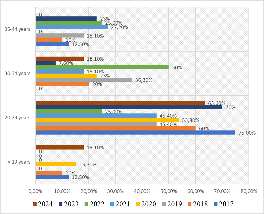 Age-Related Risk Factors. MM was most common among women aged 20–29, reflecting both higher fertility and potential care gaps even among lower-risk groups. Women over 35 and adolescents (<19) had significantly higher relative risks of MM, with respective MMRs of 156.7 and 38.3 per 100,000 live births, compared to 6.9 in the 20–29 age group (figure 5). | Figure 5. Maternal mortality by age group in the Andijan region, 2017–2024. Data presented as percentages of total maternal deaths |