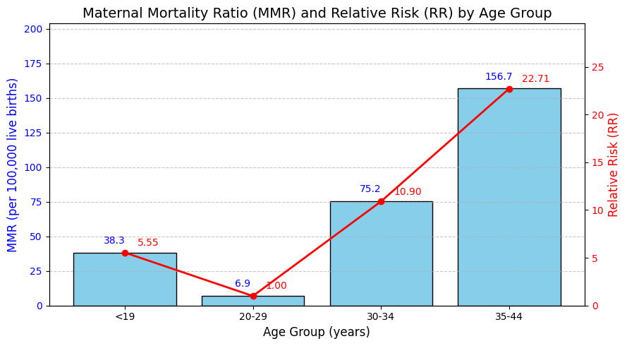 The intensive MM rate per 100,000 live births for each age group, considering all births in the respective categories, is shown in Figure 6. The highest MMR was observed in women aged 35–44 years (156.7 per 100, 000 live births), nearly 23 times greater than the baseline group of 20–29 years (6.9 per 100, 000). The relative risk (RR) of MM also increased significantly with age, reaching 22.71 for women over 35 and 5.55 for those under 19. These findings indicate high risk in both younger and older maternal age groups, underscoring the need for targeted preventive measures for these populations (figure 6). | Figure 6. MM ratio and relative risk (RR) by age groups. Data normalized per 100 000 live births; RR calculated relative to 25–29 age group |