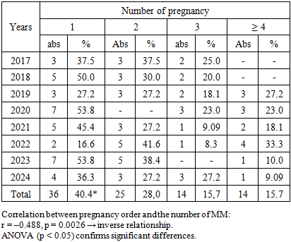Parity. The data from 2017 to 2024 indicate that MM is most frequent among women in their first pregnancy, constituting 40.4% (36 cases) of total deaths. Women with two pregnancies represent 28.0% (25 cases), while those with three or four and more pregnancies each account for 15.7% (14 cases). Notably, the proportion of deaths among primigravida peaked in 2018 and 2020, exceeding 50%. In contrast, mortality among women with four or more pregnancies showed a peak in 2019 and 2022, with 27.2% and 33.3% respectively. These patterns suggest parity as an important risk factor with varying impact over time. The consistent presence of maternal deaths across all parity groups underscores the importance of tailored healthcare strategies targeting both first-time and multiparous mothers (tab. 1).Table 1. Maternal mortality by parity (order of pregnancy), Andijan region, 2017-2024. Data presented as percentages of total maternal deaths  |