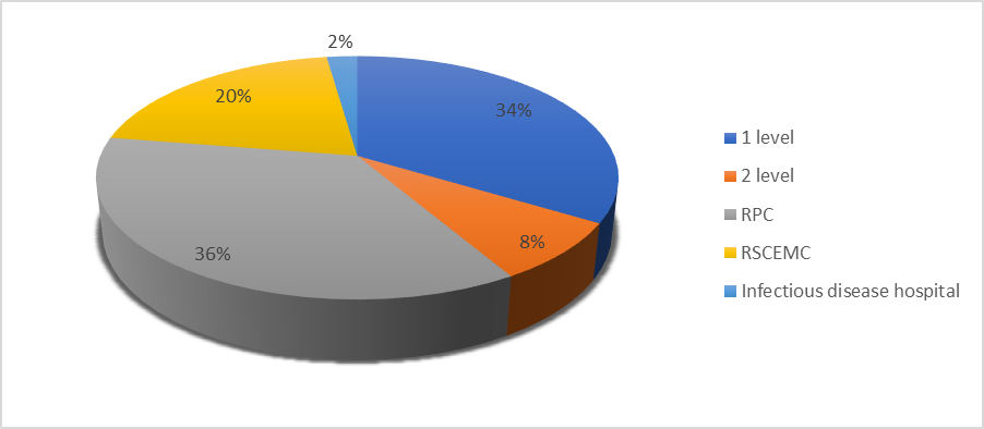 Location of MM cases. The analysis of MM distribution across different types of medical facilities demonstrated that the highest proportion of cases occurred in regional perinatal centers (36%) and first-level district medical organizations (34%). A considerable share of deaths was also registered in the Republican Scientific Center for Emergency Medical Care and its affiliated branches (20%). In contrast, a substantially lower proportion was observed in second-level city medical organizations (8%), while the lowest incidence was recorded in infectious disease hospitals (2%) (figure 7). The elevated proportion of cases in regional perinatal centers may be attributed to the referral and concentration of the most severe clinical conditions requiring highly specialized care. Meanwhile, the significant share of deaths at the first-level district organizations likely reflects delays in seeking medical assistance, limited capacity for early diagnosis, and resource constraints at the local level. MM cases identified in the Republican Scientific Center for Emergency Medical Care were predominantly associated with transfers of patients from obstetric hospitals in critical condition due to severe extragenital pathology, necessitating urgent specialized intervention. The minimal proportion of cases in infectious disease hospitals can be explained by their restricted role in providing obstetric and gynecological care. | Figure 7. Location of maternal mortality cases in the Andijan region, 2017–2024. Distribution of maternal deaths by type of medical organization, expressed as percentages of total cases. Statistically significant differences were observed across groups (χ² test, p < 0.05). Source: Andijan Regional Health Authorities |