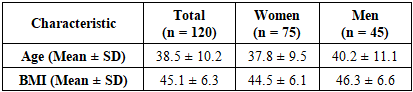 Patient DemographicsThe study's final analysis comprised 120 participants, with 75 females and 45 males. The participants had an average age of 38.5 ± 10.2 years and a mean BMI of 45.1 ± 6.3 kg/m². Women exhibited a significantly higher incidence of PONV than men (32% vs. 15%, p < 0.05).Incidence of PONV• Overall PONV rate: 26% (31 out of 120 patients)• Women had a higher PONV rate (32%) compared to men (15%)• Patients who received volatile anesthetics had a higher PONV incidence than those under total intravenous anesthesia (TIVA)Effectiveness of Triple Antiemetic Therapy• Despite prophylaxis, 14.2% of morbidly obese patients still experienced PONV• The control group (no prophylaxis) had a significantly higher incidence (42.6%, p = 0.002)• Rescue antiemetics were required in 18% of cases• Severe nausea requiring additional interventions: 8% of patientsThis table 1 summarizes the demographic characteristics of the study participants, highlighting the mean age and BMI for the total cohort and by gender.Table 1. Demographic Characteristics of Study Participants  |
