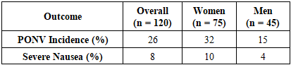 This table 2 presents the incidence of PONV and severe nausea among the study participants, showing a higher incidence in women compared to men.Table 2. PONV Incidence and Severity  |