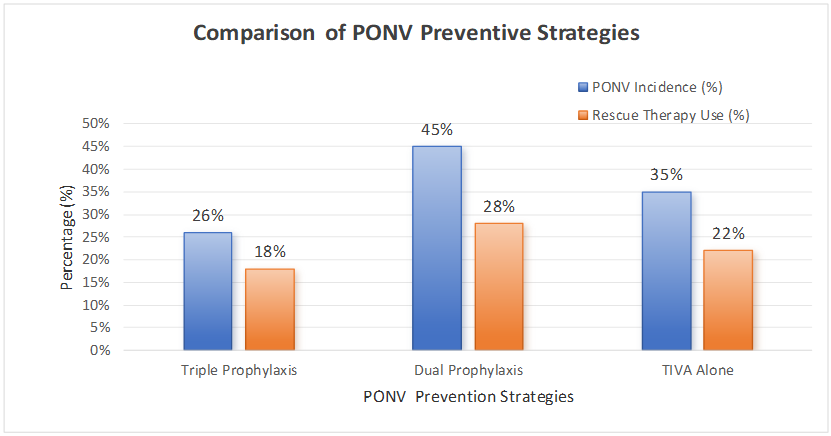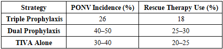 This table 3 compares the effectiveness of different PONV prevention strategies, highlighting the superior efficacy of triple prophylaxis in reducing PONV incidence and rescue therapy use.Table 3. Comparison of Preventive Strategies  |