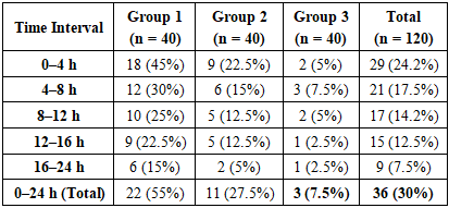 The table 4 presents the incidence of vomiting in 120 patients over the first 24 hours after surgery. The highest vomiting rates occurred within the first 4 hours, with 45% in the first group, 22.5% in the second, and only 5% in the third, indicating better early control in the third group. This trend continued over 4–8 hours, where vomiting decreased across all groups, with the third group maintaining the lowest rate at 7.5%. By 8–12 hours, vomiting incidence dropped further, with the third group still showing the best outcome at only 5%. In the 12–16 and 16–24 hour periods, vomiting remained low, with the third group reaching just 2.5%. Overall, total vomiting incidence over 24 hours was highest in the first group at 55%, moderate in the second group at 27.5%, and lowest in the third group at 7.5%, demonstrating its superior effectiveness in reducing postoperative nausea and vomiting.Table 4. Incidence of Vomiting During the First 24 Hours After Surgery (n = 120)  |