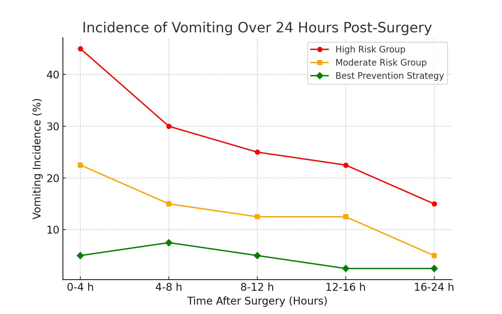 The graph 2 illustrates the incidence of vomiting among three patient groups over the first 24 hours post-surgery. The high-risk group, represented by the red line, shows the highest incidence, peaking at 45% in the first 4 hours, followed by a gradual decline to 15% after 24 hours, indicating persistent susceptibility. The moderate-risk group, shown in orange, starts with a 22.5% incidence, which steadily decreases to 5% by 24 hours, demonstrating a more controlled but present risk. The best prevention strategy group, depicted in green, maintains the lowest incidence rates, beginning at 5% and dropping to nearly 0% after 12 hours, highlighting the effectiveness of proactive antiemetic management. This trend confirms that vomiting is most frequent in the first hours post-surgery and emphasizes the critical need for early and tailored prophylactic intervention to minimize patient discomfort and improve recovery outcomes. | Graph 2. Vomiting Incidence Over Time (First 24 Hours Post-Surgery |