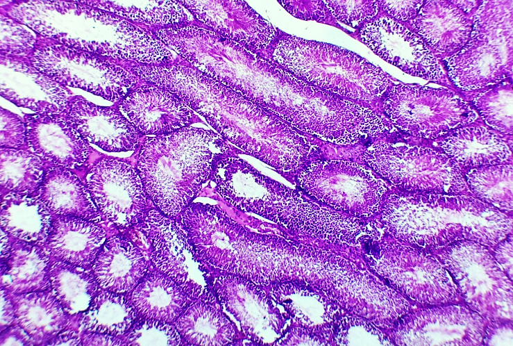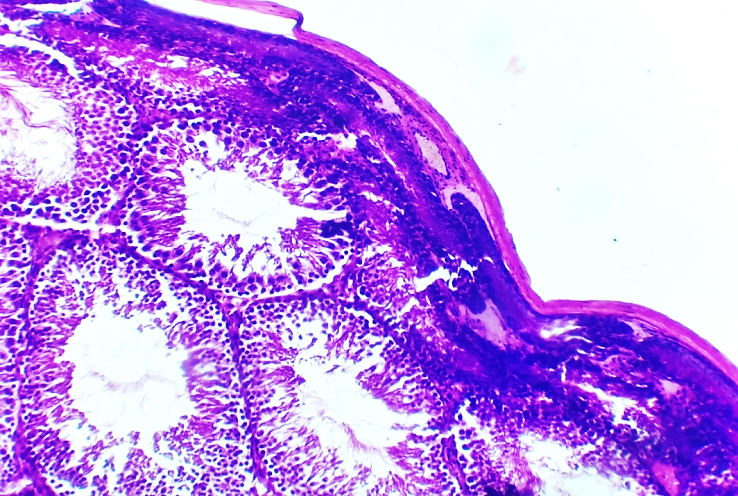 The spermatogenic epithelium and the cells developing from it during spermatogenesis were studied in the tubules located near the tunica albuginea. The thickness of spermatogenic cells ranged from 24.30 ± 3.17 µm to 42.67 ± 3.31 µm, with an average of 33.72 ± 4.56 µm. Spermatocyte cells ranged from 19.76 ± 2.31 µm to 31.61 ± 3.21 µm, averaging 27.32 ± 2.23 µm. Spermatid cells ranged from 26.45 ± 2.31 µm to 31.30 ± 4.12 µm, with a mean of 28.89 ± 2.07 µm. Spermatozoa cells ranged from 214.15 ± 13.28 µm to 275.54 ± 11.24 µm, with an average of 251.31 ± 3.24 µm. The width of the tubule lumen ranged from 17.89 ± 3.45 µm to 25.88 ± 3.16 µm, with a mean of 22.37 ± 5.02 µm. In some areas, necrosis of stratified cells involved in spermatogenesis was distinctly noticeable.In the areas that underwent the most pronounced morphological changes, measurement of the diameter of the convoluted tubules showed values ranging from 153.8 ± 1.44 µm to 172.6 ± 2.16 µm, with an average of 161.24 ± 3.25 µm. Examination of the cross-sectional area of the convoluted tubules revealed values ranging from 15,124.5 µm² to 26,045.7 µm². Although the macroscopic dimensions differed slightly from those of the control group due to edema and specific changes in the tunica albuginea of the testis and the vascular stroma, microscopy revealed that morphometric alterations were highly pronounced.In the course of studying morphometric changes in the cells located within the convoluted tubule adjacent to the vascular-rich tunica albuginea, measurements of the width of the basal membrane of the tubules and the myoid cells ranged from 14.3 ± 1.42 µm to 19.11 ± 1.12 µm, averaging 17.21 ± 2.34 µm. Sertoli cells situated on the basal membrane measured between 15.66 ± 2.02 µm and 23.21 ± 1.46 µm, with an average of 19.32 ± 2.08 µm. The height of preserved spermatogenic epithelial cells ranged from 24.3 µm to 42.67 µm, averaging 33.72 µm.