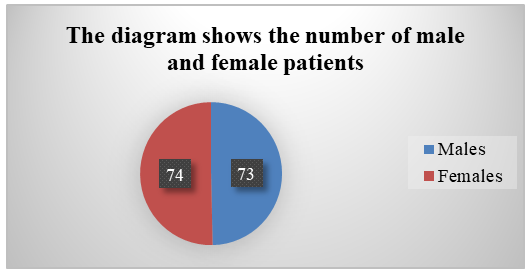 We observed 147 patients (73 males, 74 females) with knee osteoarthritis who were treated at the clinic of the National Center for Rehabilitation and Prosthetics of People with Disabilities and Traumatology Department of Multidisciplinary clinic of the Center for the development of the qualification of medical workers from 2016 to 2023. Out of the total number of patients, 147 were of working age; the working age in Uzbekistan is 16-60 y for men and 16-55 y for women. All patients were divided into 2 groups: the main group (n=75) and the control group (n=72). The main group patients underwent surgery according to our proposed method and received rehabilitation measures, while the control group patients received traditional surgical treatment and did not participate in the rehabilitation program (Fig. 1.). | Figure 1. The number of male and female patients |