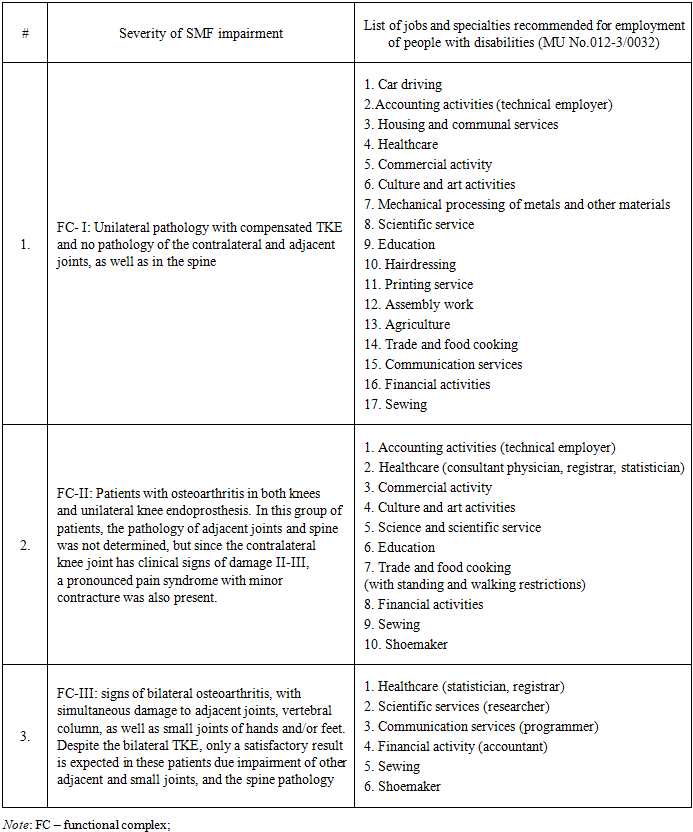 The Table demonstrates the effect of severity of osteoarthritis and SMF impairment on the number of job opportunities for TKE patients: the job lists for FC- I is more than twice longer than for FC- III (17 vs 6).The obtained clinical outcomes in the main and control groups were compared: in the main group of 120 patients, at month 3 after the TKE 21 patients scored 46.5 points, which is interpreted as “moderate rehabilitation effectiveness”. These patients presented the following complaints: flexion contracture with limited movement and pain in the operated joint, the need to use a cane when moving, significant difficulties in household self-care, and emotionally labile psychological condition. In 42 patients, more than 53 points were registered, and their result was assessed as "good rehabilitation effectiveness". These patients complained of the following: minor pain syndrome and flexor contracture < 20o of the normal value. 57 patients had no complaints about the operated joint, they scored an average of 66.8 points and their result was assessed as "high efficiency of rehabilitation”.After the repeated course of rehabilitation at month 6 after the surgery, one patient had complaints related to the operated joint. He had flexor contracture, pain syndrome in the operated joint, as well as difficulties in self-care. On average, he scored 45.3 points, and this result was rated as "moderate rehabilitation effectiveness". The following indicators were obtained in 18 other patients: flexor contracture was below normal to 10° that gave 55.8 points on the point scale, which was assessed as "good rehabilitation effectiveness". The remaining 101 patients did not present any complaints related to the operated joint. The result of their TKE was estimated at 68 points, i.e. "high efficiency of rehabilitation".In the control group of 115 patients, at month 3 following TKE, 29 patients scored 46.5 points on a point scale; this result was assessed as "moderate rehabilitation effectiveness". These patients presented the following problems: flexion contracture with limited movement and pain in the operated joint, the need to use a cane when moving, significant difficulty in household self-care, emotionally labile psychological condition. "Good rehabilitation efficiency" was noted in 62 patients (53 points). These patients presented the following complaints: minor pain syndrome and flexor contracture less than normal up to 20°. Twenty-four patients had no complaints related to the operated joint. They scored an average of 66.8 points, and their result was rated as "highly effective rehabilitation".After the second course of rehabilitation 6 months after the operation, 5 patients had complaints related to the operated joint, they had flexion contracture, pain syndrome in the operated joint, difficulties in household self-care. The condition of these patients was defined as "moderate rehabilitation efficiency" (average 45.3 points). The following outcomes were obtained in 39 patients after the repeated course of rehabilitation: flexion contracture is below normal to 10° that gives 55.8 points on the point scale, which was assessed as "good rehabilitation effectiveness". The remaining 71 patients did not have any complaints related to the operated joint, they scored 68 points on the point scale, and their result was assessed as "highly effective of rehabilitation".After the early, comprehensive, individual rehabilitation covering medical, social and vocational aspects of rehabilitation, the main group patients demonstrated the following proportion of efficiency of rehabilitation: high efficiency was registered in 91.7% of cases, good efficiency - in 8.2% of cases, and in 0.4% of cases, the effectiveness of rehabilitation was moderate.In the control group, the patients who did not use early, individual and comprehensive rehabilitation technologies, the following results were obtained: in 79.7% of cases, the effectiveness of rehabilitation was high, in 17.9% of cases, it was good, and in 2.3% of cases, the effectiveness of rehabilitation was moderate.Thus, the proposed method of early, comprehensive, individual, continuous medical, social and vocational rehabilitation has enlarged the number of patients with high rehabilitation efficiency by 12% and has made the proportion of patients with moderate efficiency 1.9% lower than in the control group. The criteria developed by us to determine TKE patient's ability to work include: the general condition of the patient, taking into account concomitant pathologies and involvement of other parts of the ODS in the pathology; the degree of SDF disorder, the supportive ability of the operated leg, and the degree of their compensation; vocational activity, taking into account educational status, harmful factors that affect the outcome of the surgery, as well as the patient’s social status; the need for outside help as well as ability of using public transport.Function Control - I: in case of a slight disorder of the SDF and the supportive ability of the operated leg, the job capacity prognosis is favourable. With such disorders, all types of jobs may be offered (except for those with excessive physical exertion) and light types of sports exercises, e.g., walking, swimming, cycling, non-intensive running. With such indicators, the patients do not meet the criteria for disability. FC – II: moderate impairment of the SDF and the supportive ability of the operated leg, minor restrictions in work and sports, which do not prevent working under conditions that require walking and standing for a long time. Working conditions should provide the opportunity to change body posture and avoid prolonged stress with alteration to sedentary work. Patients of this category are allowed to walk and swim, since these sports do not affect the functions of the operated joint.FC –III: marked disorder of the SDF and the operated leg supportability; these patients, in addition to 