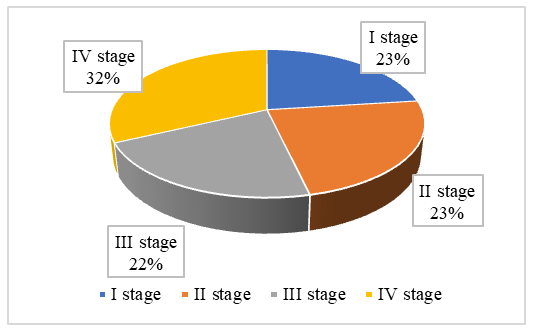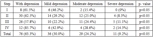A total of 120 patients with Parkinson's disease (PD) underwent clinical and neuropsychological evaluation within the framework of the study. The general data showed that the distribution of patients by age and gender covered various categories, with the majority of them being in the age range of 40–70 years. The study revealed a high prevalence of depressive disorders in patients with PD. was recorded. A total of 76 patients (63.3%) had a depressive syndrome.When analyzing the gender distribution of patients with depression, it was found that 42 (55.3%) of them were women, and the remaining 34 (44.7%) were men. This indicates that depressive disorders in Parkinson's disease are relatively more common, especially among women. At the same time, the fact that depression is also common in male patients means that it is a significant clinical problem in both sexes. Thus, the analyses conducted showed that depression is widespread in patients with Parkinson's disease, especially in women, and its clinical significance is high.Parkinson's disease duration the spread of depression with mutual dependence The study is of clinical importance. The analysis showed that among patients with an initial duration of 1–3 years, depression was relatively rare - 18 (15%). The highest rate was observed in the group of patients with a duration of 4–6 years, of whom 64 (53.3%) were diagnosed with depression (p<0.01). In recent years, this rate has decreased: depression was noted in 25 patients (21%) with a duration of 7–10 years, and in 13 patients (11%) with a duration of more than 10 years. Thus, the data obtained show that depression is most common in the middle stage of Parkinson's disease (4–6 years), and then there is a tendency to decrease with increasing disease duration, Table 1.This is probably due to the fact that neurodegenerative processes, dopaminergic and serotonergic imbalances, and psychoemotional changes peak in the middle stage of the disease. Later, part of the depressive syndrome becomes less pronounced in the clinical picture due to the "shutdown" of motor and cognitive disorders or adaptation mechanisms. The HAM-D (Hamilton Depression Rating Scale, HDRS) scale was used to assess the severity of depressive symptoms in patients with Parkinson's disease.The analysis found that as the stages of Parkinson's disease according to the Hoehn & Yahr classification increase, the prevalence of depression increases proportionally.Taken to the information according to, 120 people with depression syndrome observed in 76 patients (63.3%), Fig. 1. | Figure 1. Parkinson's disease to the stages looking at depression spread |