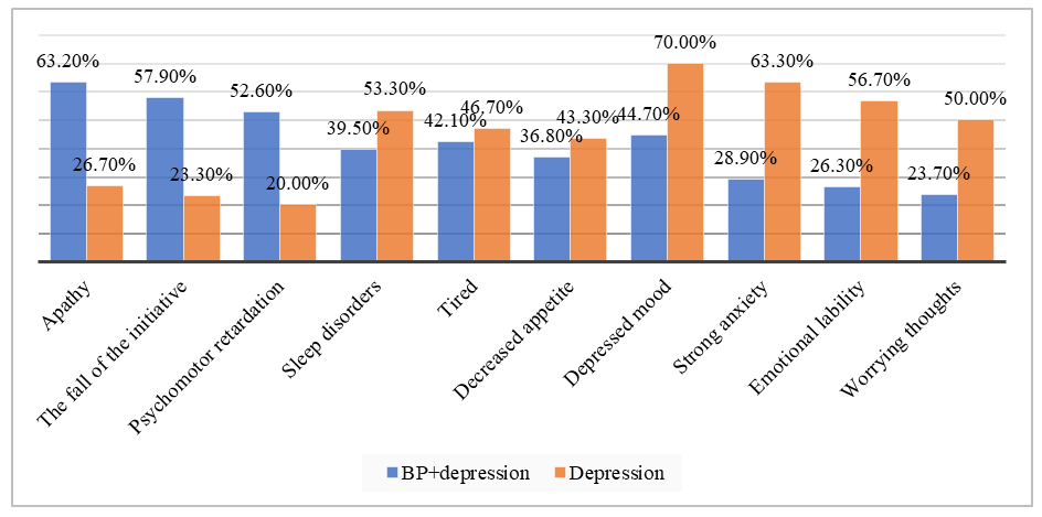 The obtained data show that as the stages of Parkinson's disease increase, the cases of depression also increase, and its clinical manifestations change from a mild form to moderate and severe levels. This condition has important prognostic and therapeutic value in the early diagnosis of depression in Parkinson's disease and the development of complex treatment tactics.To compare the clinical features of the depressive syndrome, all depressed patients were divided into two groups: (1) depression with Parkinson's disease (n=76) and (2) patients without Parkinson's disease, only depression (n=30). The prevalence of each symptom in the groups was compared using Fisher's exact test. In addition, the Odds Ratio (OR) and 95% confidence interval (CI) were calculated for each condition. This method allowed us to quantitatively estimate how much more or less likely the symptoms were to occur in the PD + depression group. According to the results, apathy (63.2% vs 26.7%; OR=4.7; 95% CI: 1.85–11.99; p=0.001), decreased initiative (57.9% vs 23.3%; OR=4.5; 95% CI: 1.73–11.81; p=0.002), and psychomotor retardation (52.6% vs 20.0%; OR=4.4; 95% CI: 1.63–12.10; p=0.002) were statistically significantly more common in patients with depressive syndrome characteristic of Parkinson's disease.On the other hand, affective and anxiety symptoms—e.g., depressed mood and severe anxiety—were significantly more prevalent in the depression group. In particular, severe anxiety was reported in 28.9% vs 63.3% (OR=0.24; 95% CI: 0.10–0.58; p=0.002), indicating the dominance of anxiety factors in the clinical picture of non-Parkinson depression, Figure 2. | Figure 2. Clinical features of depressive syndrome |