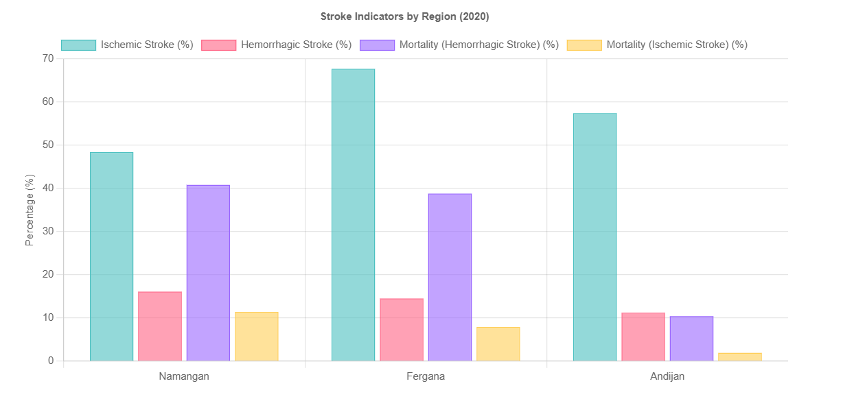 A comparative analysis of the indicators of acute cerebrovascular accident (CAI) in three regional branches of the Republican Scientific Center for Emergency Medical Care (RSSPMCE, RSSPMCE, RSSPMCE) for 2020 revealed significant regional differences in the structure and outcomes of stroke. In all regions, the prevalence of ischemic stroke is observed, with a share ranging from 48.4% in the Namangan region to 67.7% in the Fergana region. The lowest frequency of hemorrhagic stroke was noted in the Andijan region - 11.2%, and the highest - in the Namangan region (16.1%). These data indicate a relative similarity in the structure of stroke within the Fergana Valley, while differences in mortality and mortality remain significant. The mortality rate from hemorrhagic stroke remains extremely high in all studied regions, reaching a maximum in the Namangan region (40.8%), while in the Fergana region it was 38.8%, and in the Andijan region - 10.4%. Such differences may be related to the unequal level of vascular centers' equipment, hospitalization periods, and accessibility of neurosurgical care. At the same time, the overall mortality rate from ischemic stroke ranged from 1.9% (Andijan) to 11.4% (Fergana). Notably, despite the lower incidence of stroke among neurological diseases in Andijan (47.1%), the mortality rate for general indicators was 67.7%, which may indicate late patient admission or concomitant diseases that worsen the course of stroke. It should be noted that in the Fergana region, the proportion of cerebrovascular diseases among all neurological pathologies was the highest (71.8%), reflecting the high burden of vascular pathology on the regional healthcare system. In the Namangan region, this indicator was 68.0%, which also confirms the significance of stroke as a leading cause of hospitalization and mortality in the structure of neurological morbidity. Figure 1 Comparative Analysis of Stroke Indicators (2020). | Figure 1. Comparative Analysis of Stroke Indicators (2020) |