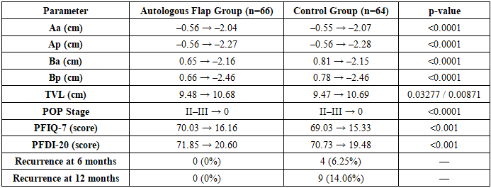 Significant postoperative improvements were observed in both study groups based on POP-Q measurements, subjective symptom scores, and recurrence rates. At 6 months post-surgery, none of the patients in either group exhibited clinical signs of pelvic organ prolapse (POP), indicating successful anatomical restoration. Comparative analysis of POP-Q point localization before and after surgery revealed statistically significant changes across all measured parameters (p < 0.05), confirming the efficacy of both surgical approaches.In the autologous flap group (AFG, n = 66), the mean values of anterior compartment points (Aa, Ba) improved from –0.56 ± 0.25 cm and 0.65 ± 0.17 cm preoperatively to –2.04 ± 0.11 cm and –2.16 ± 0.12 cm postoperatively, respectively (p < 0.0001). Similar improvements were noted in the control group (CG, n = 64), with Aa and Ba shifting from –0.55 ± 0.22 cm and 0.81 ± 0.31 cm to –2.07 ± 0.10 cm and –2.15 ± 0.11 cm, respectively (p < 0.0001). Posterior points (Ap, Bp) and total vaginal length (tvl) also showed significant enhancement in both groups. The average prolapse stage decreased from grade II–III to 0 in all patients postoperatively.Subjective quality-of-life assessments using PFIQ-7 and PFDI-20 questionnaires demonstrated marked symptom relief. In the AFG, PFIQ-7 scores decreased from 70.03 ± 6.58 to 16.16 ± 6.65, and PFDI-20 scores from 71.85 ± 4.84 to 20.60 ± 5.53 (p < 0.001). The CG showed similar reductions: PFIQ-7 from 69.03 ± 6.70 to 15.33 ± 6.56, and PFDI-20 from 70.73 ± 5.00 to 19.48 ± 5.95 (p < 0.001). The mean score differences were statistically significant in both groups (p = 0.000001), with average reductions of 53.88 ± 2.12 and 51.26 ± 3.55 points in the AFG, and 53.71 ± 1.79 and 51.25 ± 3.64 points in the CG for PFIQ-7 and PFDI-20, respectively.During follow-up at 6 and 12 months, no cases of POP recurrence were recorded in the autologous flap group. In contrast, the control group exhibited 4 cases (6.25%) of recurrence at 6 months and 9 cases (14.06%) at 12 months, indicating a statistically and clinically relevant difference in long-term outcomes.Table 1. Summary Diagram: Key Outcomes by Group  |