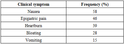 Among the examined patients, dyspeptic manifestations were found in 72% of cases. Nausea (58%) and epigastric pain (46%) were predominant symptoms. Heartburn occurred in 39% of patients, whereas bloating and vomiting were reported in 28% and 15% respectively. The frequency and distribution of symptoms are shown in Table 1.Table 1. Clinical manifestations of dyspepsia in patients with haemoblastoses  |