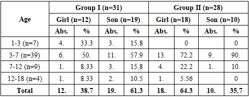 To conduct the study, a comprehensive clinical and laboratory examination total of 59 patients participated in the study, who were divided into two groups:Group I (main group, n=31) - patients underwent a modified surgical method (Combination of methods of L.E. Frolova - F. Braithwaite, modification of M.I. Azimov in asymmetrical cases), postoperative care was carried out with chlorhexidine solution and MILT (magnetically induced laser therapy).Group II (comparison group, n=28) - patients were operated on using traditional methods of uranoplasty, with postoperative care provided with furacilin solution and tubus-quartz irradiation.Patients were divided into comparative sex-age groups by age, sex, and duration of the disease. All patients underwent the following pre- and postoperative assessments: clinical examination, rhinoscopy, electromyography, microbiological analyses, and oral hygiene indices (PMA and OHI-S).The main criteria for the study were the rate of wound healing, the dynamics of signs of inflammation, cases of fistula recurrence, changes in the activity of the soft palate muscles, speech and voice function, as well as the number of postoperative infectious complications.Patients applied to the Center for Emergency Medical Care, and all of them (parents) were explained the purpose of the study and their consent was obtained.All patients in the study were divided into two main groups for a comparative analysis/ A total of 59 children participated in the study, of which 31 were in group I (main group) and 28 in group II (comparison group). According to the results of the age distribution, the majority of patients were aged 3-7 years: 17 (54.8%) children in group I and 22 (78.6%) children in group II. This indicates that operations to eliminate congenital palate defects are usually performed in children at the stage of speech function formation. (Table 1):Table 1. Distribution of patients in the study group by age and sex, n=59  |