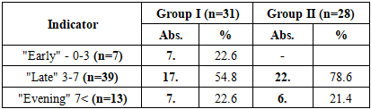 In terms of sex composition, in group I, the number of boys was 19 (61.3%), girls - 12 (38.7%), while in group II, girls prevailed - 18 (64.3%), boys - 10 (35.7%). The difference in sex distribution was not statistically significant (χ2 = 2.14; p > 0.05), i.e., it was confirmed that there was no gender imbalance between the two groups.When assessing the age distribution, the proportion of children under 3 years of age in group I was 7 (22.6%), and in group II only 0 (0%) cases. In this case, the risk ratio (RR) = 2.26 [95% CI: 1.14-4.49], i.e., the proportion of children operated on at an early age in group I was statistically significantly higher. This result indicates the possibility of using the modified surgical method even at a young age.The proportion of children aged 3-7 years was significantly higher in group II (78.6%), which indicates a trend towards delayed surgical intervention by the traditional method at this age (OR = 2.67; 95% CI: 1.01-7.05; p < 0.05).In the age category 7-12 years, 4 (12.9%) cases were registered in group I, and 5 (17.9%) in group II (χ2 = 0.25; p > 0.05). Patients aged 12-18 years constituted a small proportion in both groups (3 in group I - 9.7%, 1 in group II - 3.6%).In the study, patients were divided into three categories depending on the duration of the disease: "early" (0-3 years), "late" (3-7 years), and "late" (more than 7 years). This assessment is aimed at showing the clinical significance of the interval between the detection of palate defects and the time of their surgical correction (Table 2).Table 2. Distribution of patients by disease duration, n=59  |