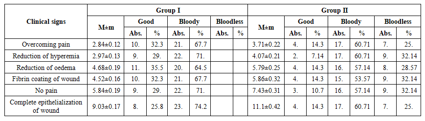 In the 1st group, the length of hospital stay was significantly reduced. The vast majority of patients - 20 (64.5%) - reached a clinically stable state within 6-7 days after surgery, in 4 (12.9%) patients the hospital stay was limited to 4-5 days, and in 7 (22.6%) patients, recovery lasted 8-9 days. These indicators indicate that the treatment process in the hospital was active and stable.In the 2nd group, the length of stay in the hospital was significantly longer. Only 1 (3.57%) patient stabilized within 4-5 days, recovery was observed in 5 (17.9%) patients in 6-7 days, in 10 (35.7%) patients in 8-9 days, and in 12 (42.9%) patients in 10-15 days. This result indicates a weak stabilization of the postoperative wound condition and the inflammatory reaction.The average length of hospital stay was 6.81±0.24 days in the 1st group and 9.50±0.51 days in the 2nd group. This difference is statistically significant and is significant at the level of (p<0.01).This result is explained by the fact that the complex method of care (antiseptic treatment and MILT therapy) stabilizes the inflammatory process earlier, activates microcirculation in mucous and epithelial tissues, thereby reducing the time of clinical recovery.From a physiological point of view, the biostimulating effect of MILT therapy increases phagocytic activity and stimulates the regeneration process in tissues. Local treatment with chlorhexidine ensures an aseptic environment and limits the development of infectious agents. As a result of the combined effect of these two factors, patients recovered clinically more quickly and shortened their stay in the hospital.Thus, in the 1st group, where the complex care method was used, the length of stay of patients in the hospital was significantly less and reduced by an average of 1.4 times compared to traditional care (p<0.01). This scientifically confirms the clinical effectiveness of complex therapy and its advantage in accelerating the rehabilitation process.