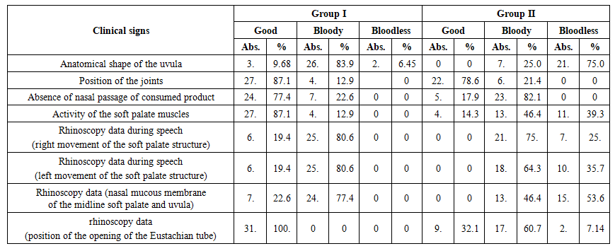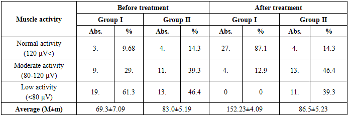 In the 1st group, the number of patients with complete restoration of the anatomical form of the uvula was 26 (83.9%), while in the 2nd group this figure was 7 (25.0%). Consequently, first methods were effective in restoring anatomical integrity, the difference was statistically significant (p>0.05).Regarding the condition of the sutures, good recovery was noted in 27 (87.1%) patients in the 1st group, and in the 2nd group, a good result was noted in 22 (78.6%) cases. This indicates that the wound healing process was faster and more stable in the 1st group.The absence of passage of food and fluid into the nasal passage after surgery was ensured in 24 (77.4%) patients in the 1st group and in 5 (17.9%) patients in the 2nd group. These results reflect the complete restoration of nutritional physiology in the 1st group.The activity of the soft palate muscles was restored with active movement in 27 (87.1%) patients in the 1st group, while in the 2nd group this indicator was observed only in 4 (14.3%) cases (t=3.42; p<0.01). This difference indicates that the modified surgical method effectively restores the functional mobility of the palate.According to rhinoscopy data, symmetrical and rhythmic movement of the soft palate during speech in the 1st group after surgery was noted in 100.0% of patients, while in the 2nd group this indicator was up to 64.3%. In this case, the difference is also statistically significant (p<0.05). At the same time, the condition of the Eustachian tube opening also significantly improved after surgery: in the 1st group, the physiological state was restored in 100% of patients, and in the 2nd group, this indicator increased to 32.1%.According to the data of Table 4, anatomical integrity and functional activity were restored quickly and consistently in group 1, the differences in suture condition, muscle activity, and rhinoscopic indicators were statistically significant (p<0.05-0.01).In conclusion, it can be noted that the modified method of surgery, along with the restoration of the anatomical structure, also significantly stabilized the physiological movements of the palate.Electromyographic analysis makes it possible to assess the activity of the palatal muscles and the degree of neuromotor recovery after surgery. According to the data in Table 8, a decrease in muscle activity was noted in patients before surgery, which is associated with functional insufficiency of the palate and weakening of neuromuscular connections.Table 5. EMG results of soft palate muscles  |