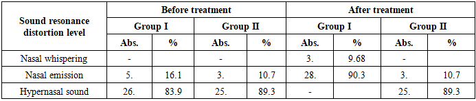 Before surgery, normal activity (120 μV<) was observed in only 3 (9.7%) patients in group 1, while in group 2 - in 4 (14.3%) cases. Low activity was detected in 19 (61.3%) patients in the 1st group and 13 (46.4%) in the 2nd group, which indicates a sharp decrease in neuromuscular activity.After the operation, a clear positive dynamic of muscle electrical activity was observed. In group 1, normal activity was restored in 27 (87.1%) patients, and in group 2, only in 4 (14.3%) patients. This difference is statistically significant and is significant at t=4.68; p<0.001.In group 1, EMG activity increased on average from 69.3±7.09 μV to 152.23±4.09 μV, i.e., almost a twofold increase was observed. In the 2nd group, this indicator reached from 83.0±5.19 μV to 86.5±5.23 μV, without significant changes (p>0.05).These data indicate that the bioelectric potentials of the palatal muscles were actively restored after surgery, and the functional re-innervation process was more active in the 1st group.Thus, EMG analysis shows that the modified surgical method has high effectiveness in restoring the neuromotor function of the palatal muscles. Normalization of electrical activity is closely related to the physiological mobility of the palate and voice resonance, which is an important clinical indicator of postoperative functional rehabilitation.The data in Table 6 reflect the changes in the process of speech resonance and phonation in patients before and after surgery. Sound resonance is directly related to the functional activity of the palatopharyngeal ring (PPR), the restoration of which is an important clinical criterion for the effectiveness of the operation.Table 6. Sound Recognition Results  |