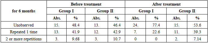 Before the operation, patients had a high level of speech disorders, such as hypernasal sound, nasal emission, and nasal whispers. In particular, in the 1st group, hypernasal sound was detected in 26 (83.9%) patients, and in the 2nd group - in 25 (89.3%) cases. These indicators confirm insufficiency of the phonation function of the palate.After the operation, a clear positive dynamic was observed in speech resonance. In the 1st group, the hypernasal sound disappeared completely, and in 90.3% of patients, the sound resonance returned to normal. In the 2nd group, such a result was observed in only 10.7% of patients. This difference is statistically significant (t=4.12; p<0.001).In the 1st group, in 3 out of 5 patients with nasal emission during sound production achieved improved voice resonance (p<0,001). There was no improvement in voice in the 2nd group. This indicates that the PPR closing function has been restored.A general assessment of the dynamics of sound resonance shows that in the 1st group, the acoustic characteristics of speech, especially the timbre and articulatory accuracy of the voice, are fully normalized. Physiologically, this is associated with the function of the phonic closure of the palate, the restoration of the balance of the respiratory tract and control over the airflow.Otitis media is one of the characteristic complications of palate defects, the origin of which is associated with impaired ventilation function of the Eustachian tube due to improper attachment of the lower end of the m. levator veli palatini and inflammation of the posterior nasal part (Table 7).Table 7. Occurrence of otitis media  |