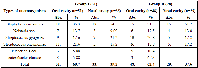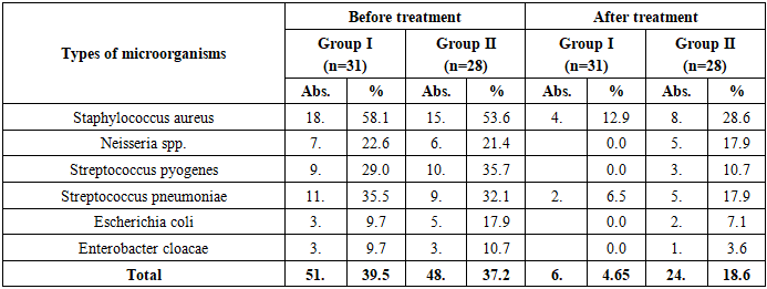 Before the operation, cases of otitis were noted in the vast majority of patients: in the 1st group, 3 (9.7%) patients had two or more relapses, and 13 (41.9%) patients had a single relapse within 6 month. In the 2nd group, this indicator was noted in 3 (10.7%) and 12 (42.9%) patients, respectively. Although the difference was not statistically significant (p>0.05), the high frequency of otitis in both groups indicates that it is a functional complication of palate defects.After surgery, the frequency of otitis recurrence sharply decreased. In the 1st group, otitis was not observed at all in 24 (77.4%) patients, while in the 2nd group this indicator was 15 (53.6%). Recurrent cases persisted in only 7 (22.6%) patients in the 1st group and in 11 (39.3%) patients in the 2nd group. This difference was statistically significant and was assessed as significant at t=2.38; p<0.05.The most important trend is that the recurrence of otitis two or more times after surgery was not detected in the 1st group, while in the 2nd group it persisted in 2 (7.14%) cases. This indicates that the functional activity of the Eustachian tube recovered faster in group 1 after surgery.The decrease in the frequency of postoperative otitis is directly related to the restoration of the morphofunctional integrity of the palate and the physiological normalization of the nasal-cough reflex. After the movement of the palatopharyngeal ring (PPR) is restored, nasal cavity pressure stabilizes and posterior ear ventilation improves, which reduces the risk of inflammation.Microbiological analysis made it possible to assess the pre- and postoperative infectious background, as well as the effectiveness of complex antibacterial therapy (Table 8).Table 8. Microbiological status of patients in the study groups, n=59  |