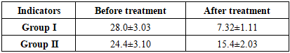 When assessing the recovery processes after surgery, the main indicators - pain, hyperemia, edema, fibrin deposition, and the duration of complete epithelialization - were taken into account.In the 1st group, the pain syndrome subsided on average by 2.84±0.12 days, and in the 2nd group by 3.71±0.22 days, the difference was significantly significant (t=3.29; p<0.01). Consequently, the pain disappeared faster in the 1st group. This is explained by a decrease in the activity of inflammatory mediators in tissues and a rapid restoration of microcirculation. The passage of food and fluid into the nasal passage after surgery was significantly reduced in both groups.A decrease in hyperemia was noted on days 2.97±0.13 and 4.07±0.21, respectively. These indicators indicate a weakening of the inflammatory reaction and rapid activation of microcirculation.The decrease in edema was also observed in the 1st group by 4.68±0.19 days, and in the 2nd group this period extended to 5.79±0.25 days. Also, fibrin coating of the wound was eliminated in the 1st group in 4.52±0.16 days, and in the 2nd group in 5.86±0.32 days. This indicates a faster cleansing process.Loss of pain in the wound area was detected on day 5.84±0.19 in group 1 and 7.43±0.31 in group 2. Complete formation of epithelialization occurred in 9.03±0.17 days in the 1st group and in 11.1±0.42 days in the 2nd group (p<0.01).These results are explained by the rapid reduction of the inflammatory process, early resorption of fibrin coatings, and activation of epithelial proliferation under the combined effect of local antiseptic treatment with 0,05% solution chlorhexidine bigluconate and MIL therapy.Thus, the data of Table 3 show that the clinical effectiveness of the complex treatment method is high: signs of inflammation disappeared earlier, the wound healing process accelerated, and the postoperative rehabilitation period was shortened (p<0.01).  | Table 3. Duration of the dynamics of clinical results of complex treatment of children with secondary deformities, (days, M±m) |
