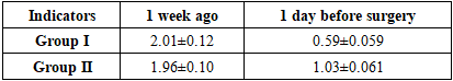 Before surgery, the PMA index in the 1st group averaged 28.0±3.03%, in the 2nd group 24.4±3.10%, which indicates that the inflammatory reaction of the oral mucosa in both groups before surgery was moderate.After surgery, as a result of comprehensive care measures, the PMA indicator in the 1st group significantly decreased and amounted to 7.32±1.11%. In the 2nd group, the PMA index decreased to 15.4±2.03% (p<0.01). The results of the study show that in the 1st group, the inflammatory process of the oral cavity decreased significantly faster, and the mucous membrane approached normal. This is primarily due to the fact that antibacterial treatment and MILT therapy activate microcirculation and reduce the activity of inflammatory mediators. From a physiological point of view, a decrease in the PMA indicator indicates a stabilization of gingival blood flow and an active course of the epithelial regeneration process.Thus, the data in Table 9 showed that the method of comprehensive postoperative care reduced the signs of inflammation in the oral cavity by half faster. This method confirms its clinical significance in improving the hygienic condition of the oral cavity, maintaining an aseptic environment, and accelerating the wound healing process (p<0.01).During the study, changes in the hygienic state of the oral cavity before surgery and 1 day before surgery were assessed using the OHI-s index. Since this index represents a quantitative assessment of microbial deposits and mineral conglomerates, it is a reliable criterion indicating the formation of the necessary aseptic conditions for postoperative reparative processes.Table 10. OHI-s results in patients of the study group (M±m)  |
