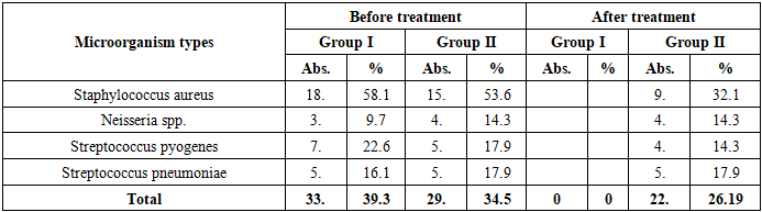 Before the operation, the OHI-S indicator in both groups was unsatisfactory: in the 1st group on average 2.01±0.12, in the 2nd group 1.96±0.10. This indicates a high level of microbial coating in the oral cavity and a tendency of gingival tissues to inflammation.After surgery, the hygienic condition improved in all patients, however, in the 1st group, the decrease in the OHI-S index was significantly greater: up to 0.59±0.059; In the 2nd group, it decreased to 1.03±0.061 (p<0.01). That is, in the 1st group, rapid resolution and limitation of the transformation of the microbial coating were observed. This is explained by the fact that the care measures carried out (antiseptic treatment and physiotherapy) activate the microcirculation of the mucous membrane, reduce inflammatory mediators, and accelerate epithelialization.The same trend was observed in the categorical assessment: the proportion of "good" hygiene was significantly higher in the 1st group, while the categories of "unsatisfactory/satisfactory" were significantly lower (p<0.01). Clinically, this was confirmed by a rapid weakening of gingival hyperemia and edema, normalization of the color and consistency of the mucous membrane.In conclusion, the dynamics of OHI-S indicates a stable provision of aseptic conditions after surgery, a decrease in the load of microbial deposits, thereby creating an optimal background for wound healing. In the 1st group, changes were significantly greater, and reparative processes were confirmed to be faster and more stable (p<0.01).The data in the following table provide a comparative analysis of the state of the oral cavity microbiome before and after surgery in patients with secondary deformation of the palatine defect. These indicators play an important role in reducing the infectious background and assessing the effectiveness of complex antibacterial therapy. Conditionally pathogenic microorganisms such as Staphylococcus aureus, Streptococcus pyogenes, Streptococcus pneumoniae, Neisseria spp., Escherichia coli, and Enterobacter cloacae were detected in the oral cavity of patients before surgery. They can prolong the inflammatory process and slow down the healing process.After treatment, significant changes in the microbiological composition were observed. In the 1st group, the isolation of S. aureus decreased from 58.1% to 12.9%, and in the 2nd group - from 53.6% to 28.6% (p<0.01). This result represents the bactericidal effect of complex antiseptic treatment.Table 11. Analysis of the dynamics of changes in the oral microflora of patients during treatment  |