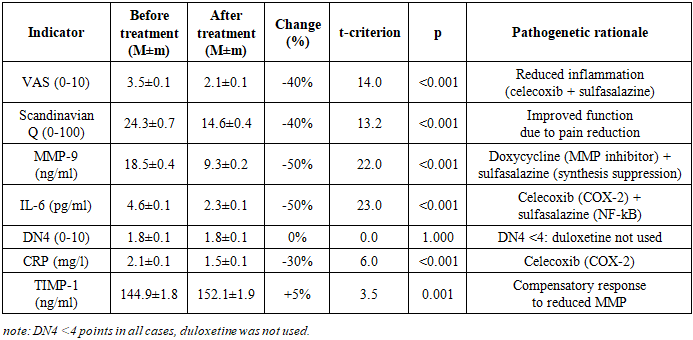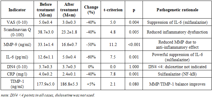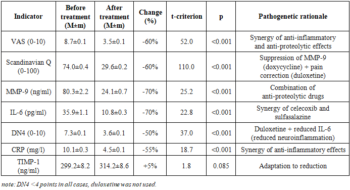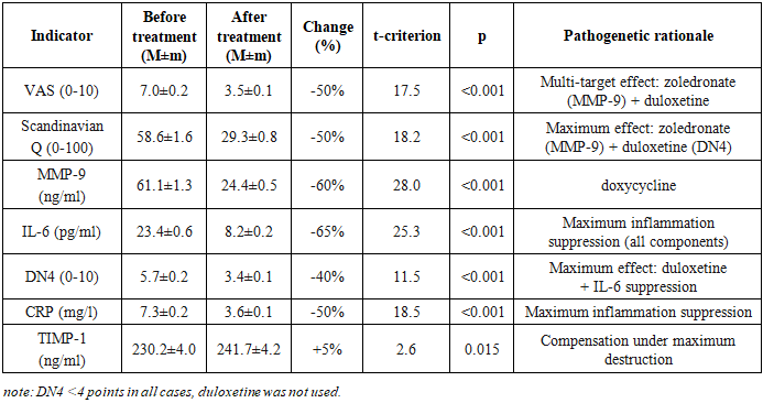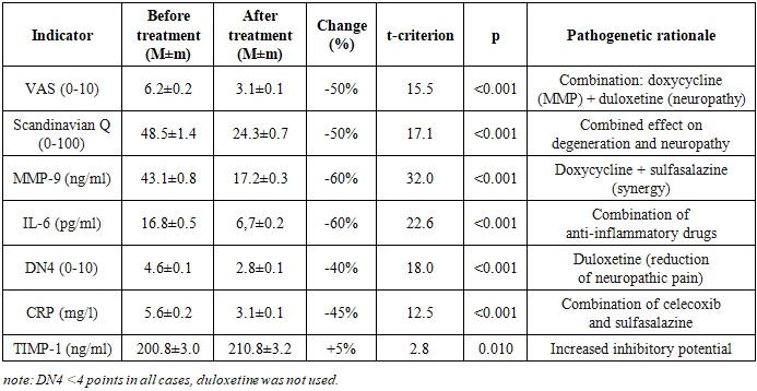 Study Design. An open-label prospective comparative study of 120 patients (68 women, 52 men, mean age 48.7±8.2 years). Patients were divided into 5 groups depending on the leading morphological substrate of DDSD according to MRI data: Group 1: Disc protrusion (n=38); Group 2: Ligamentum flavum hypertrophy (n=6); Group 3: Disc herniations (n=23); Group 4: Disc herniations + Disc protrusions (n=27); Group 5: Disc herniations + Ligamentum flavum hypertrophy (n=26).Inclusion criteria were: clinically and instrumentally (MRI/CT) verified diagnosis of DDSD (protrusion, disc herniation, ligamentum flavum hypertrophy or their combinations); moderate or severe pain syndrome (VAS≥3); age from 18 to 65 years; informed patient consent. Exclusion criteria were: severe somatic pathology (decompensated cardiac, hepatic, renal failure); active infectious diseases; oncological diseases; pregnancy, lactation; allergy or intolerance to the study drugs; history of spinal surgery for the current exacerbation; intake of other NSAIDs, tetracycline antibiotics, SNRI antidepressants, bisphosphonates within 3 months prior to the study.All patients received basic combined pathogenetic therapy: Celecoxib: 200 mg/day (selective COX-2 inhibitor); Sulfasalazine: 2 g/day (anti-inflammatory agent, NF-kB inhibitor); Doxycycline: 20 mg/day (tetracycline antibiotic with anti-proteolytic activity, MMP inhibitor). Personalization of therapy: if a neuropathic pain component was present (DN4 scale ≥4 points), Duloxetine: 60 mg/day (selective serotonin and norepinephrine reuptake inhibitor - SNRI) was added. Duration of therapy: 12 weeks.Efficacy assessment was conducted before the start of therapy and after 12 weeks of treatment. Clinical scales: Pain intensity was determined by the Visual Analogue Scale (VAS, 0-10). Functional status - by the Scandinavian Back Pain Questionnaire (0-100 points, lower score indicates better function). Neuropathic pain component - by the DN4 Scale (0-10 points, ≥4 points indicates neuropathic pain). Biochemical markers (serum): MMP-9 (Matrix Metalloproteinase-9): Indicator of extracellular matrix destruction (ng/ml); IL-6 (Interleukin-6): Marker of inflammatory activity (pg/ml); CRP (C-reactive protein): Marker of systemic inflammation (mg/l); TIMP-1 (Tissue Inhibitor of Metalloproteinases-1): Indicator of inhibitory potential of proteolysis (ng/ml).Safety Monitoring. Sulfasalazine: complete blood count with leukocyte count every 2 weeks. Duloxetine: activated partial thromboplastin time (APTT), alanine aminotransferase (ALT), aspartate aminotransferase (AST) after 1 month of therapy.Statistical analysis included calculation of mean values and standard error of the mean (M±m) for all studied parameters, as well as assessment of the percentage change of each parameter after treatment relative to the baseline level; statistical significance of differences between indicators before and after therapy was determined using Student's t-test for paired samples, with the level of statistical significance set at p<0.05; additionally, correlation analysis was conducted to identify relationships between the dynamics of biochemical markers and clinical indicators, and comparative evaluation of treatment efficacy between different patient groups was performed using analysis of variance (ANOVA) or its non-parametric analogs in case of violation of data normality.