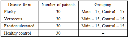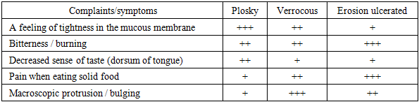 The program of work with patients was designed in stages: first, oral hygiene and the general condition of the mucous membrane were examined, then the Schiller–Pisarev and perhydrol tests were used to assess the degree of inflammation, and then the treatment (traditional or modern) appropriate to the clinical form was selected. Intergroup comparisons were performed while maintaining the proportion of age, gender and harmful habits (smoking, alcohol). During the observation period, all patients were given hygienic education, as well as recommendations to reduce factors that increase inflammation. The results are presented in detail below.Table 1. Distribution of patients according to clinical forms  |