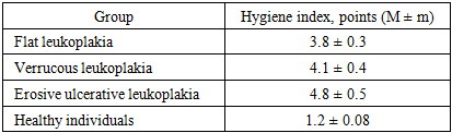 OHI indicators in patients to the healthy 3–4 times more than that it has deteriorated Verrocq himself showed and especially erosion ulcer in forms index high values mucus on the floor broken patch keratinization in the background soft tissues easy injury and cleaning difficulty with The flat figure shows that although the OHI balance is relatively low, it still indicates that hygiene is not sufficient.Table 3. Results of the Schiller–Pisarev test (staining in iodine solution)  |